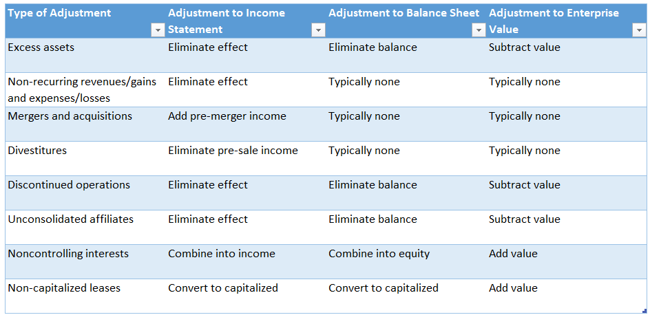 Financials must be adjusted to allow for apples-to-apples comparisons. Typical adjustments include (see table):- Excess assets – In some cases, the comparable company holds assets not essential to its core business. Such assets should be removed from the income statement, balance sheet, and cash flow statement. (Excess cash is also considered a non-operating asset, but since it is difficult to measure precisely, it is usually fully deducted in formulas.)