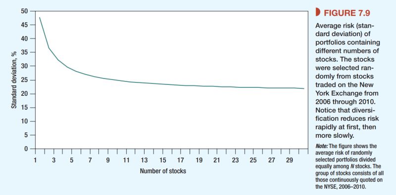ქვემოთ ფოტოზე მოცემულია 2006-2010 წლებში შემთხვევით შერჩეული აქციების რისკის დიაპაზონი. ხედავთ რომ დივერსიფიკაციის მექანიზმი უფრო ძლიერად მოქმედებს დასაწყისში, ხოლო აქციების რაოდენობის ზრდასთან ერთად მცირდება მისი ეფექტი… ითვლება რომ 30-ის შემდეგ, დივერსიფიკაციის ეფექტი უმნიშვნელოა…